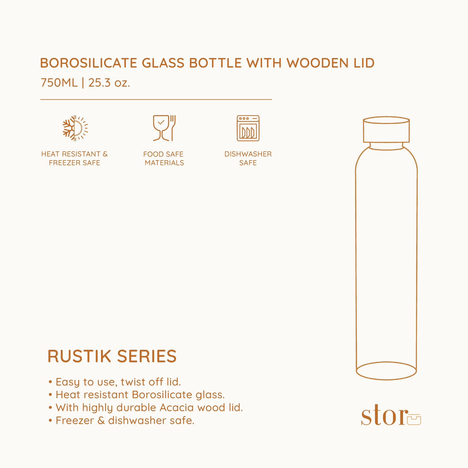 Part of our Rustik Series, this Borosilicate Glass Bottle blends everyday functionality with timeless design. Crafted from heat-resistant borosilicate glass and topped with a durable Acacia wood lid, it’s perfect for storing water, juices, or infused drinks in style. The twist-off lid ensures easy use, while its minimalist form complements any kitchen or table setup.