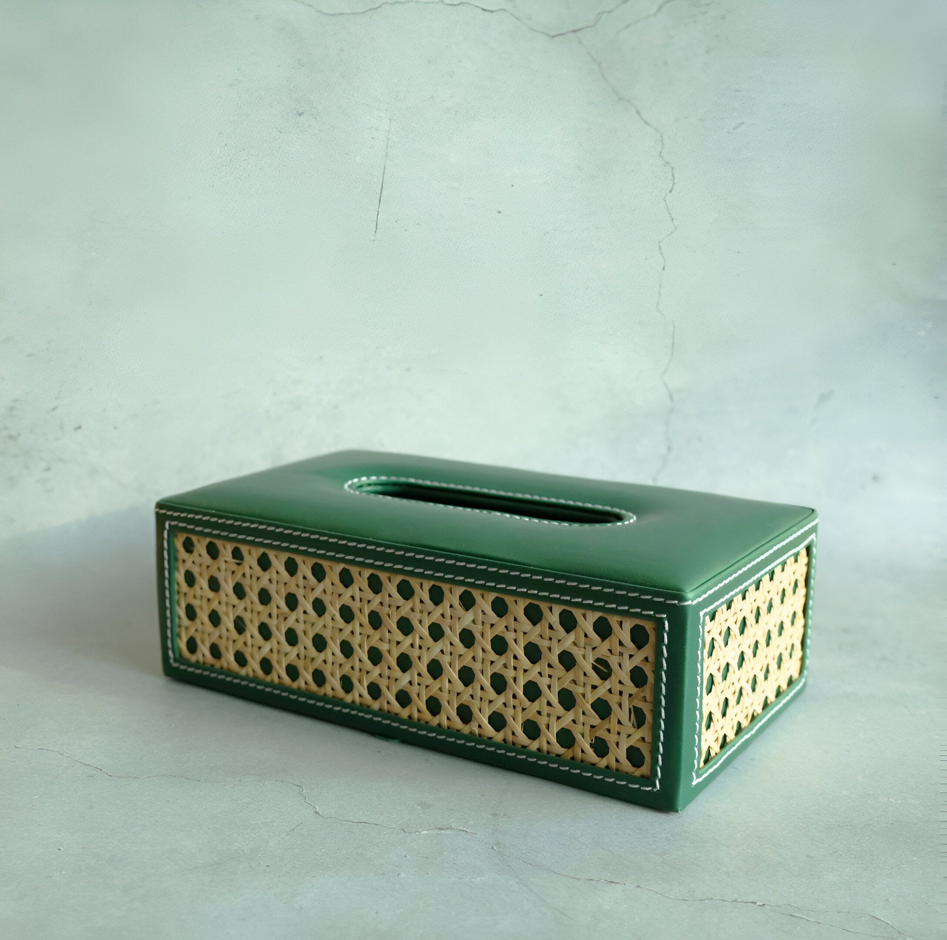 Emerald Green PU Leather & Rattan Tissue Box - Rectangle