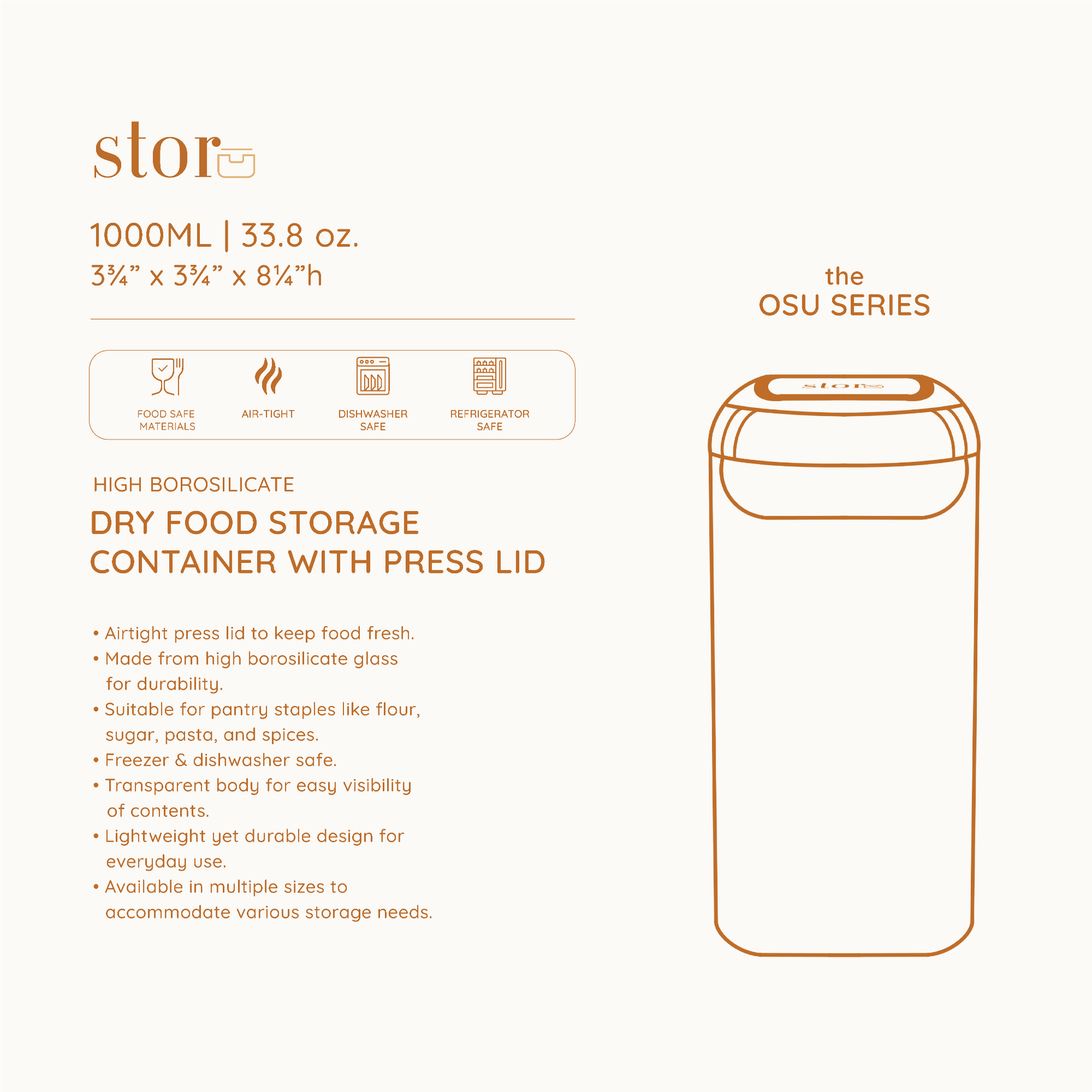 Keep your kitchen fresh and organised with our Glass Storage Container with Press Lid, crafted from premium borosilicate glass and topped with an airtight stainless steel press lid. Designed to lock in freshness, it’s perfect for storing pantry staples like flour, sugar, pasta, or spices. Lightweight yet durable, this container blends function and elegance for modern kitchen organisation.
