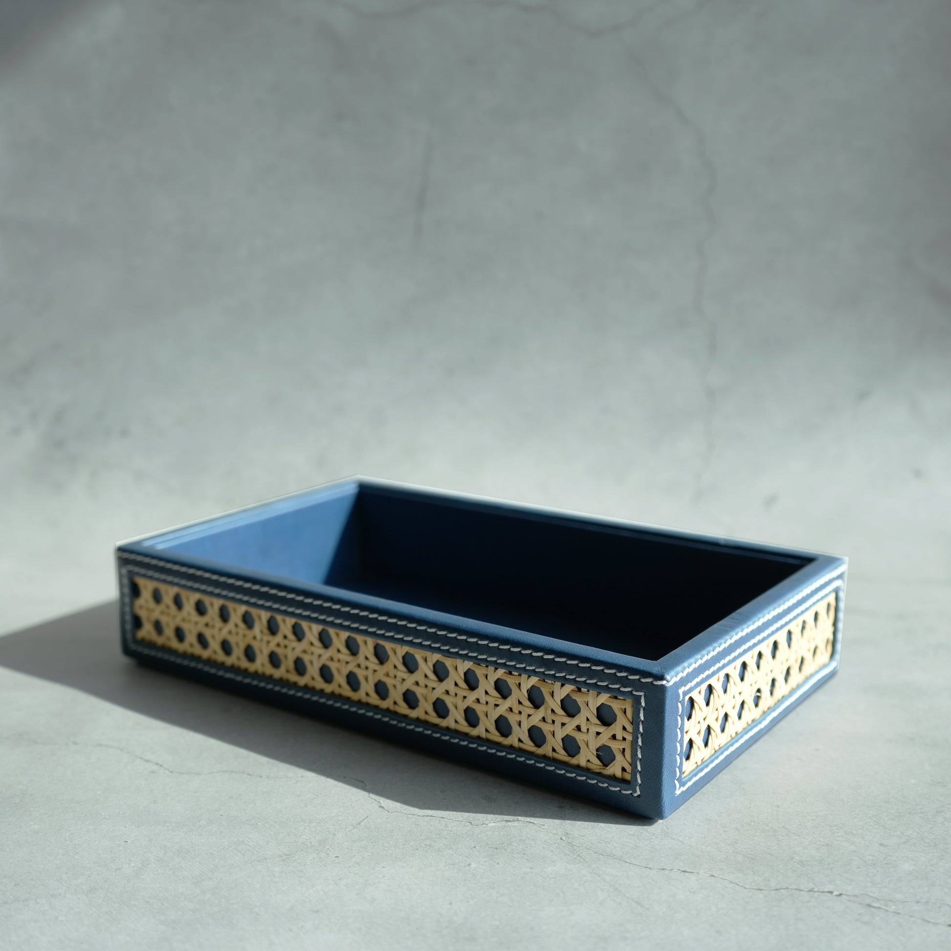 Steel Blue PU Leather & Rattan Serving Tray - Small