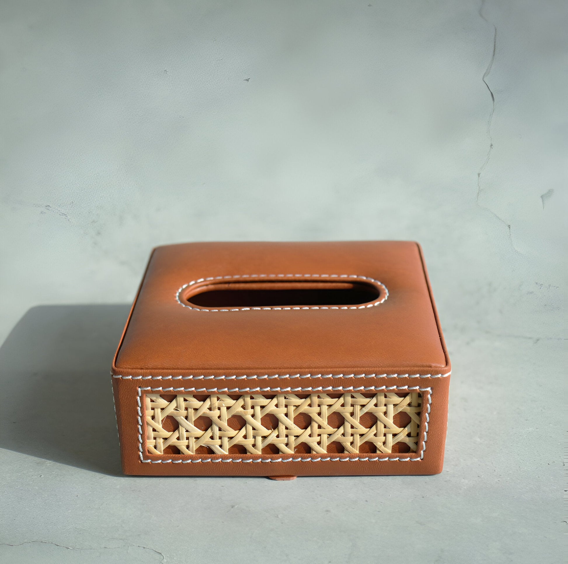 Tan Brown PU Leather & Rattan Tissue Box - Square