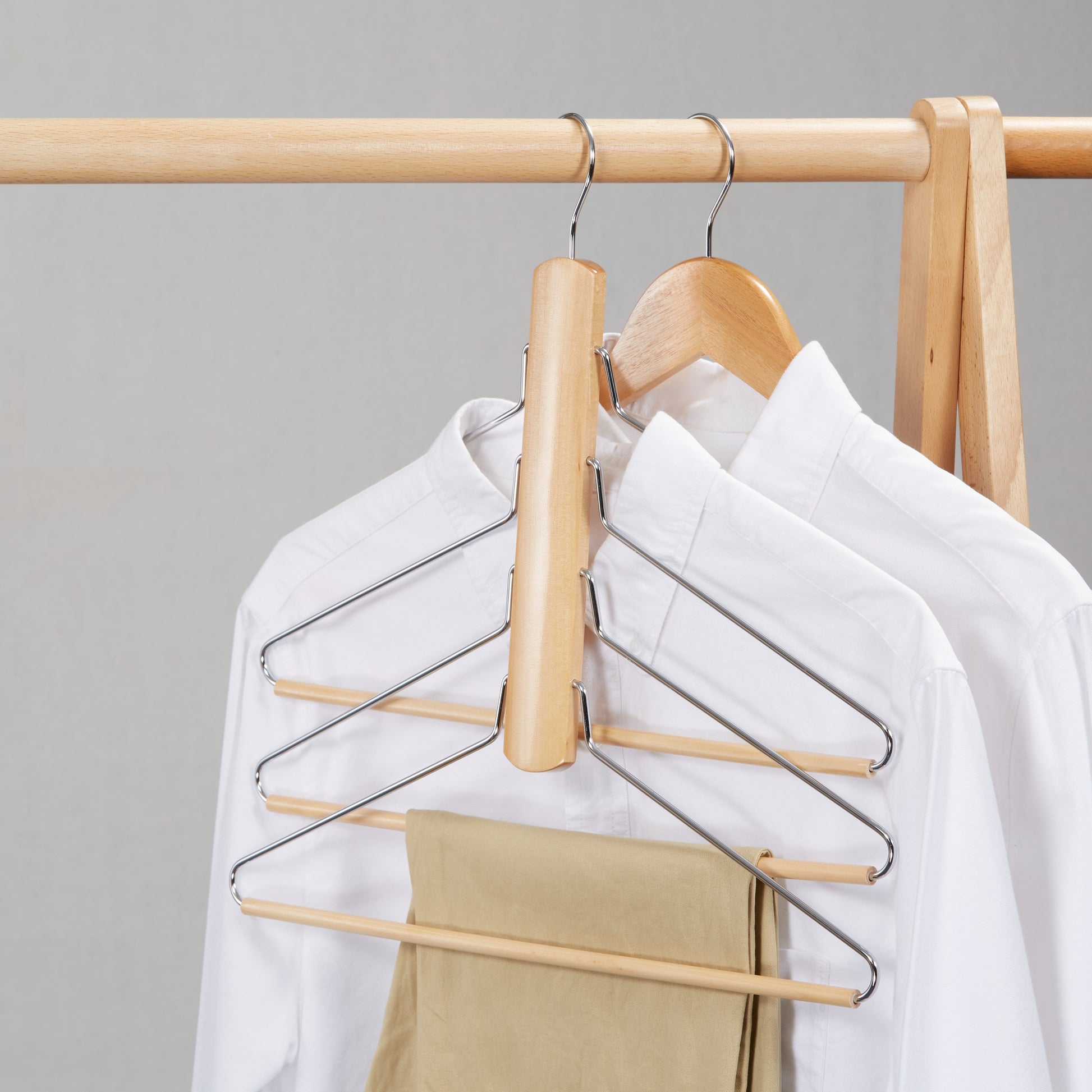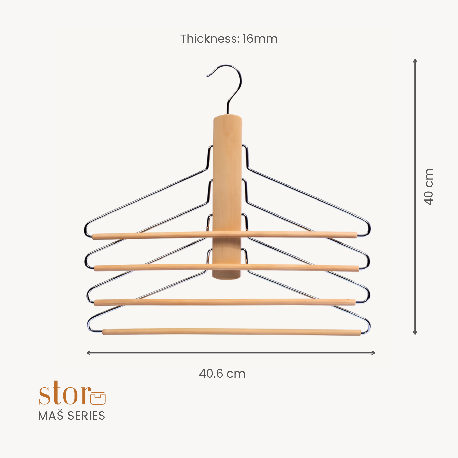 Crafted from premium lotus wood, this 4-tier trouser hanger is designed for function and finesse. Featuring a satin swivel hook and non-slip bars, it keeps trousers, sarees, and scarves securely in place. The slim ½” profile and vertical design help maximize closet space while maintaining garment structure — keeping your wardrobe neat, organized, and wrinkle-free.